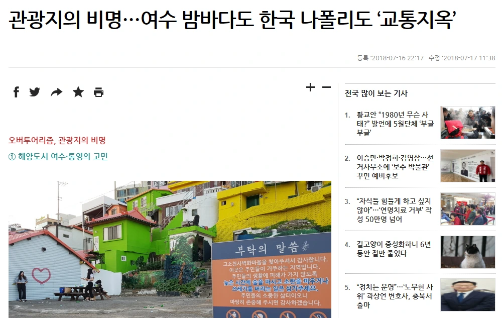 관광지에 오버 투어리즘이라는 주제가 화두가 됐다. 여수 밤바다에, 전주 한옥마을에, 강릉 커피거리에, 제주 애월에, 과거에는 없던 관광지의 비명이 들려오기 시작했다. 그 비명은 관광지에 사는 주민들로부터, 관광도시에 사는 시민으로부터 조금씩 새어나왔다. 관광객들이 너무 많이 오는 바람에 주민들이 불편을 겪게된 것이다. 문을 열 수 없을 정도로 시끄러워졌고 차가 지나갈 수 없을만큼 교통량이 많아졌다. 이를 감내해야하는 건 아무런 혜택도 없는, 그곳에 살던 사람들이었다.