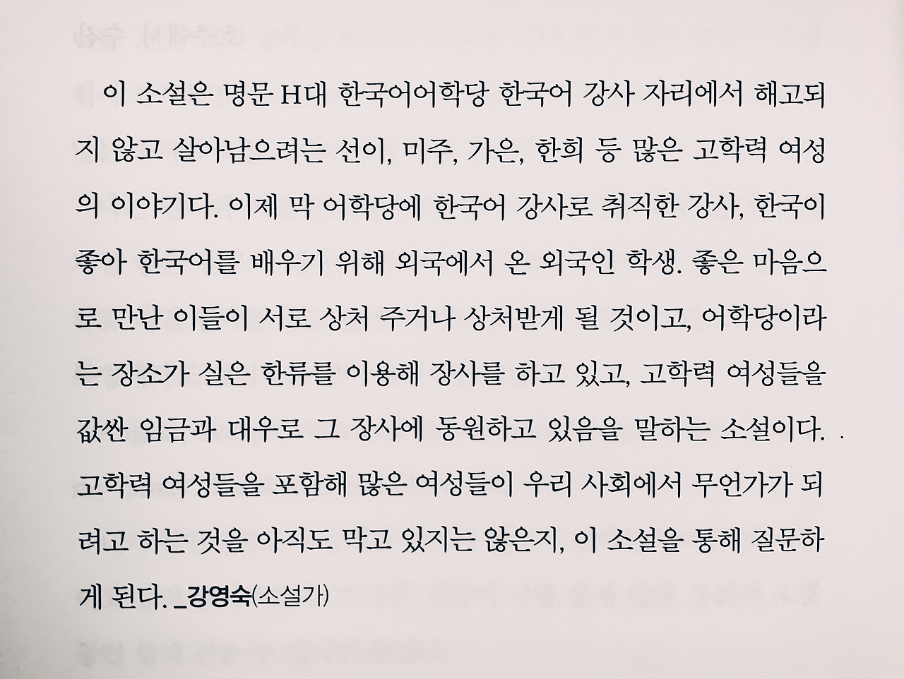 「코리안 티처」는 H대학 한국어학당의 시간 강사인 선이, 미주, 가은, 한희의 이야기를 그리고 있다. 나는 한 챕터, 한 챕터를 읽을 때마다 선이, 미주, 가은, 한희가 되었다. 부당한 요구에도 ‘까라면 까야지’라고 생각하는 선이와 잘릴 땐 잘리더라도 못하는 건 못하는 거라고 말하면서도 대학원 학자금과 생활비 때문에 내심 불안해하는 미주, 어떻게든 강의평가 1등을 받고 싶어 하는 가은과 살아남기 위해 갑질을 당하는 것과 하는 것 모두에 익숙해져 버린 한희까지. 이들 중 누구 하나를 나쁘다고 말할 수 있을까? 한국어 강사로 일하다 보면 무수히 많은 선이와 미주, 가은과 한희를 만나게 된다.
