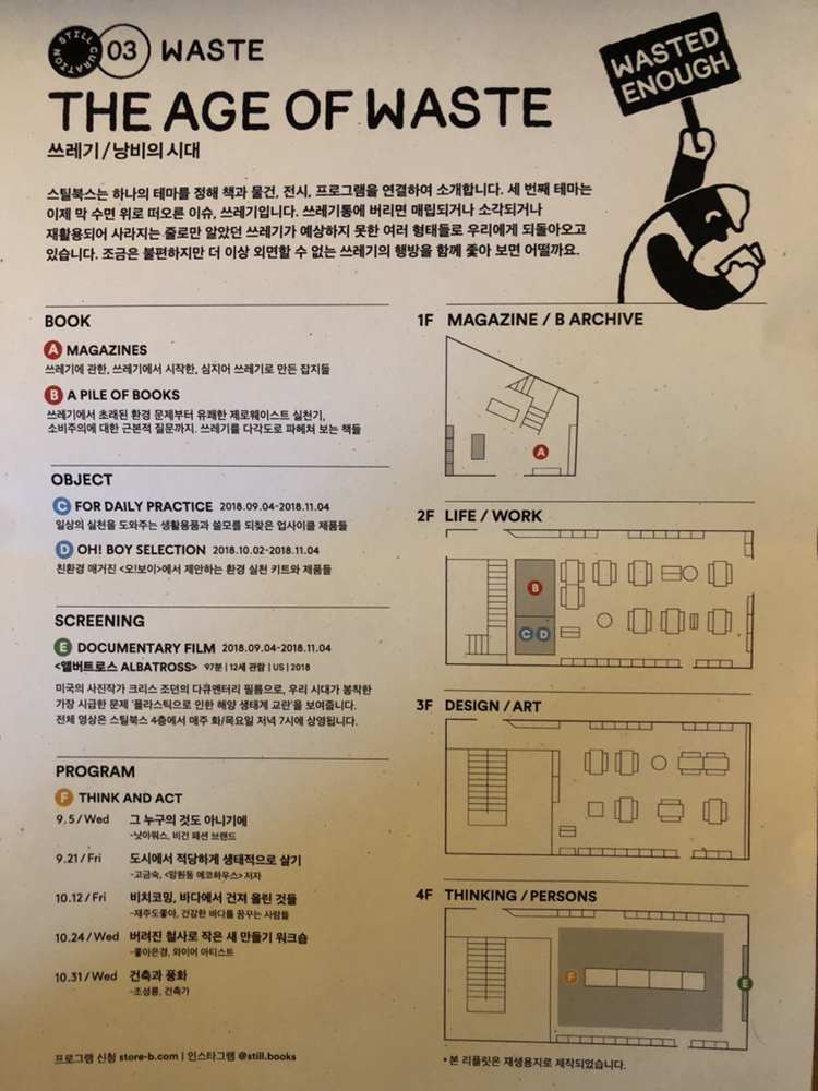 메인 테마를 여기서는 스틸 큐레이션이라고 부른다. 이번 스틸 큐레이션의 키워드가 쓰레기와 낭비이며 이것도 주기적으로 바뀌는 것 같다. 이번 큐레이션이 마음에 들었으니 다음 큐레이션이 궁금해지는 건 당연한 이치. 개인적으론 서점의 다음 큐레이션이 궁금해진 첫 경험이다. 대형서점에서는 시선이 많이 분산되어서 그런지는 몰라도 그러한 기대감을 느끼기 힘들었다. 지금까지 다녀 본 몇몇 독립서점에서도 크게 이런 느낌을 받은 적은 없었다.