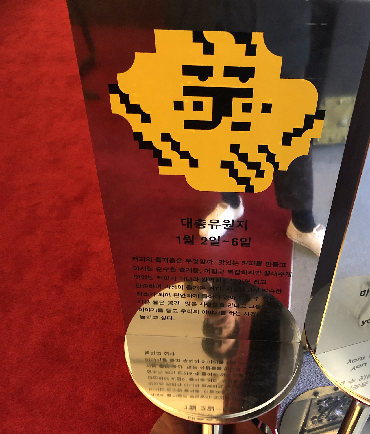 뭐니뭐니해도 이 전시의 피날레를 장식하는 것은 건물 꼭대기층에 있는 <근대의 맛>이라는 공간입니다. 이곳이 바로 우리나라 스페셜티 카페들이 일정 기간동안 팝업스토어를 여는 곳이죠. 클래식 음악과 함께 짙은 붉은색 카펫위에 펼쳐진 넓직한 공간에 앉아 있으니 마음이 안정되면서도 어딘가 새로운 느낌이었습니다. 그 공간과 커피를 향유하며 거의 2시간은 앉아 있었던 것 같습니다.