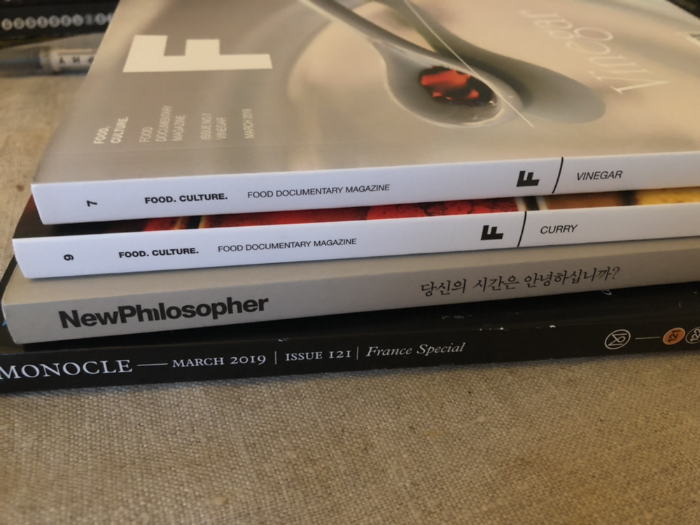 열대야에 잠을 제대로 이루지 못하던 게 며칠 전이었는데 이젠 조금이나마 선선한 바람이 불기 시작했습니다. 혹시 휴가들은 다녀오셨는지요. 저는 고향인 ‘거제도’로 다녀왔습니다. 잡지 몇 권과 함께 그냥 시원한 에어컨 아래서 휴가를 보냈습니다. 힙지수를 지속적으로 업데이트하기에 잡지만한 게 또 없습니다. 지난 몇 년 간 소셜미디어 때문에 위기에 허덕이던 잡지 업계였지만 그 사이에 새로운 돌파구를 찾은 퍼블리셔들이 많이 생겼습니다. 업계의 전반적인 트렌드는 분야의 세분화와 다양화였습니다. 브랜드 다큐멘터리 <매거진B>와 함께 최근에 발행을 시작한 식재료/음식 다큐멘터리 <매거진F>, 라이프스타일 잡지인 <Bear>, 철학 잡지 <뉴필로소피> 등등 읽을거리가 다양해졌습니다. 이런 트렌드를 반영하듯 잡지 큐레이션을 해주는 서점이 나오기도 했죠.