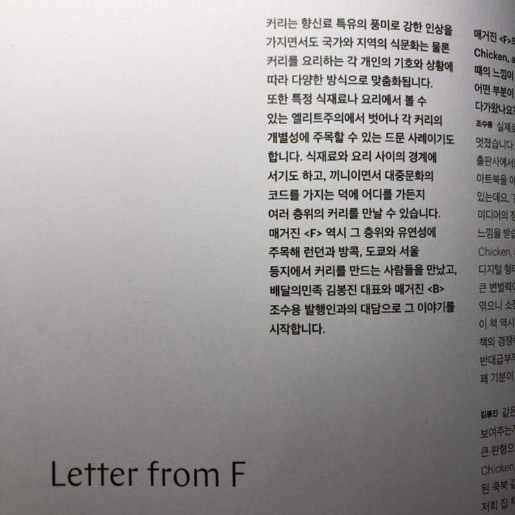 지난 글에도 언급했지만 지금 제가 가장 관심을 두고 있는 음식이 바로 카레입니다. 이제 막 관심을 가지기 시작했는데 타이밍도 딱이었네요. 관심만큼 훌륭한 성장의 연료가 또 없죠. 보는 내내 많은 영감과 자연스레 여러 상상을 하게 되었습니다. 잡지를 시작하는 첫 문단에서부터 카레 혹은 커리라는 음식에 대한 새로운 관점이 눈에 들어왔습니다. 식재료와 요리 사이의 경계에 있다거나 끼니이면서도 대중문화의 코드를 가지고 있다는 점이 흥미로웠습니다.