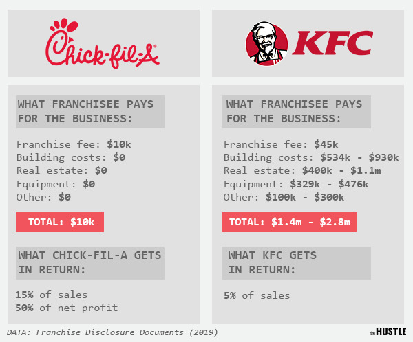 일반적인 프랜차이즈 구조와는 달리 칙필레는 매장에 들어가는 오픈 비용을 모두 본사 측에서 부담한다. 대신 본사 로열티에서 수익의 일부를 충당하는데, 매출의 15% 수준이다. 상당히 높은 로열티다. 우리나라 프랜차이즈들은 많아봐야 3% 수준이고 미국에서는 일반적으로 4~6% 정도를 내야 한다. 언뜻 보면 우리나라의 편의점 프랜차이즈의 수익구조가 생각이 나지만 그것과는 또 다르다.