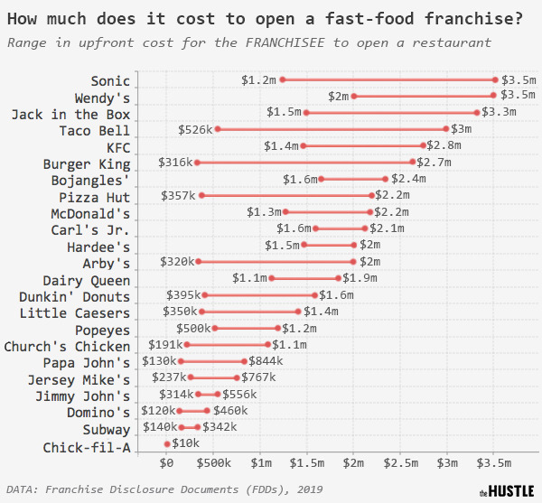 칙필레가 나의 눈길을 사로잡은 건 단 $10,000(약 1100만 원)에 가맹점을 오픈할 수 있다는 사실 때문이다. 이게 얼마나 낮은 금액인지 비교해보자.