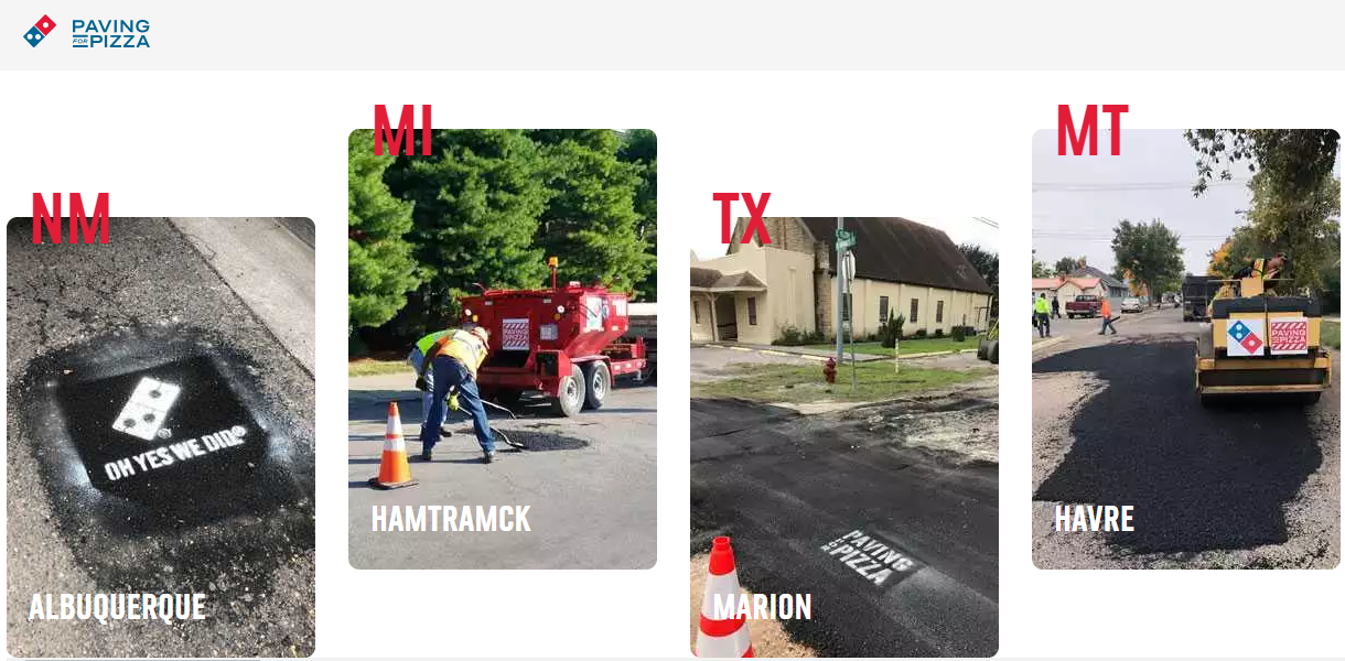 +Paving for Pizza: 2018년 이후로 도미노는 도로에 움푹 파인 곳을 직접 공사하여 메꾸는 "Paving for Pizza" 프로젝트를 진행하고 있습니다. 그 이유는 푹 꺼진 도로로 인해 배달 중 피자가 망가지는 것을 막기 위함인데요. 굳이 이렇게까지 할 필요가 있을까 싶지만, 도로에 난 구멍에 의해 차량이 흔들리면서 피자가 흐트러지는 경우가 많다는 사실을 데이터를 통해 발견했기 때문이죠. 'Paving for pizza' 웹사이트에 가면 실제 배달 중인 피자 박스 안에 카메라를 달아 어떻게 망가지는지 확인할 수도 있는데요. 단계별로 망가지는 영상이 재밌네요ㅎ