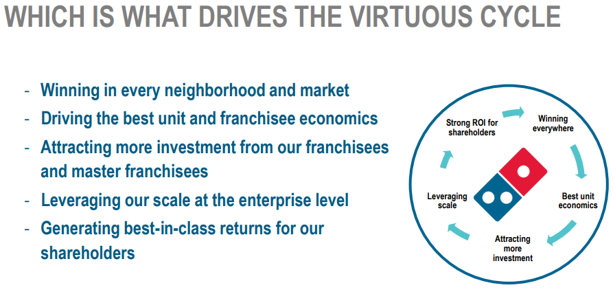 이러한 전략은 "선순환 구조(virtuous cycle)"를 만드는데요. 도미노는 요새 전략을 통해 규모의 성장이 이루어지면 매출과 수익성이 증가하고 이는 회사의 가치가 극대화로 이어진다고 설명합니다. 뭐 쉽게 말하자면 규모의 경제로 인해 구매력이 생기고 운영 비용이 내려가며, 기술에 대한 투자를 더욱 많이 할 수 있는 등등의 뻔한이야기입니다(그러나 중요합니다).