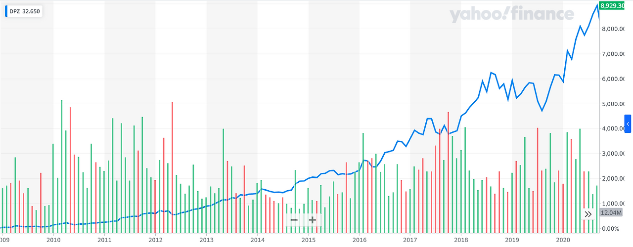 도미노가 이번 팬데믹으로 인해 유독 급성장하긴 했지만 본격적인 성장세는 2010년부터 시작되었는데요. 이때는 2018년까지 도미노를 이끌었던 패트릭 도일(Patrick Doyle)이 CEO로서의 커리어를 시작한 해입니다. 2012~2019년에는 매출성장률이 매해 12%씩 신장했을 뿐만 아니라 순수익도 매년 20%씩 따박따박 벌어 들였죠. 심지어 2009년 1월 1일 기준 2020년 9월 1일의 주가성장률은 8929%를 기록합니다. 그래서 궁금해졌습니다. 피자를 파는 회사를 이토록 성장하게 만든 것이 단순히 배달이 잘 돼서일까요?
