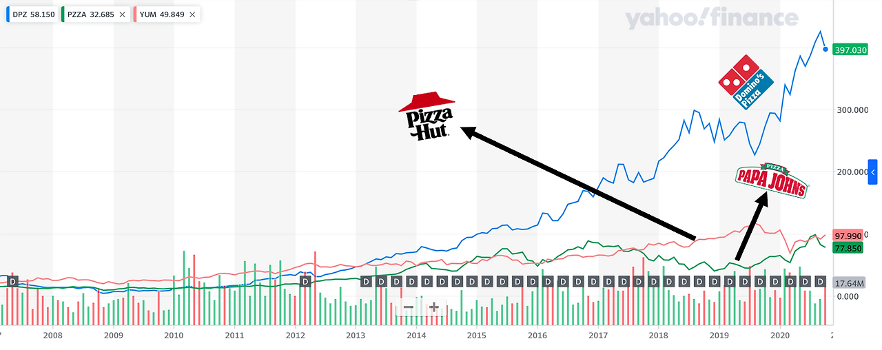 2008년부터 2020년까지의 주가 그래프입니다. 언뜻 보더라도 도미노의 주가는 하늘 높은 줄 모르고 솟아오르네요. 피자헛의 모회사인 얌브랜즈(Yum Brnads)는 2020년 10월 기준으로 상승 추세에 있지만 아직은 팬데믹 이전 수준을 회복하지 못하고 있습니다. 참고로 원래 펩시콜라의 모회사인 펩시코(PepsiCo)에서 독립한 얌브랜즈는 현재 피자헛을 비롯해 KFC, 타코벨 그리고 더해빗버거그릴(THe Habit Burger Grill)을 운영하는 그야말로 거대한 글로벌 회사입니다. 이 회사의 (2020년 10월 29일 기준)시가총액이 286.5억 달러(한화로 약 32.5조 원)인데, 재밌는 것은 이제 도미노 하나가 그 절반이 넘는 151.3억 달러(약 17.1조 원)이라는 것이죠. 이것만 봐도 도미노가 얼마나 거대해졌는지 가늠이 되시죠? 배달을 전문으로 하고 있는 파파존스도 이번 팬데믹으로 주가상승률이 도미노와 비슷한 수준을 보이고 있긴 하지만 시가총액은 도미노의 17% 수준인 26.2억 달러입니다. 에헴,여기 낄 자리는 아닌 듯하네요.