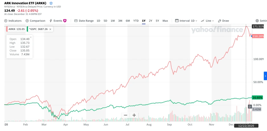 2020년 금융시장에서 가장 핫 했던 투자자를 꼽으라면 단연 뉴욕의 헤지펀드사인 'ARK Investment Maangement'가 아닐까 합니다. 가장 대표적인 ETF인 'ARK Innovation ETF(ARKK)'의 2020년 수익률은 171%를 기록합니다. EFT 중에서 2020년 수익률이 가장 높으며 S&P 500과도 현격한 차이를 보이네요.