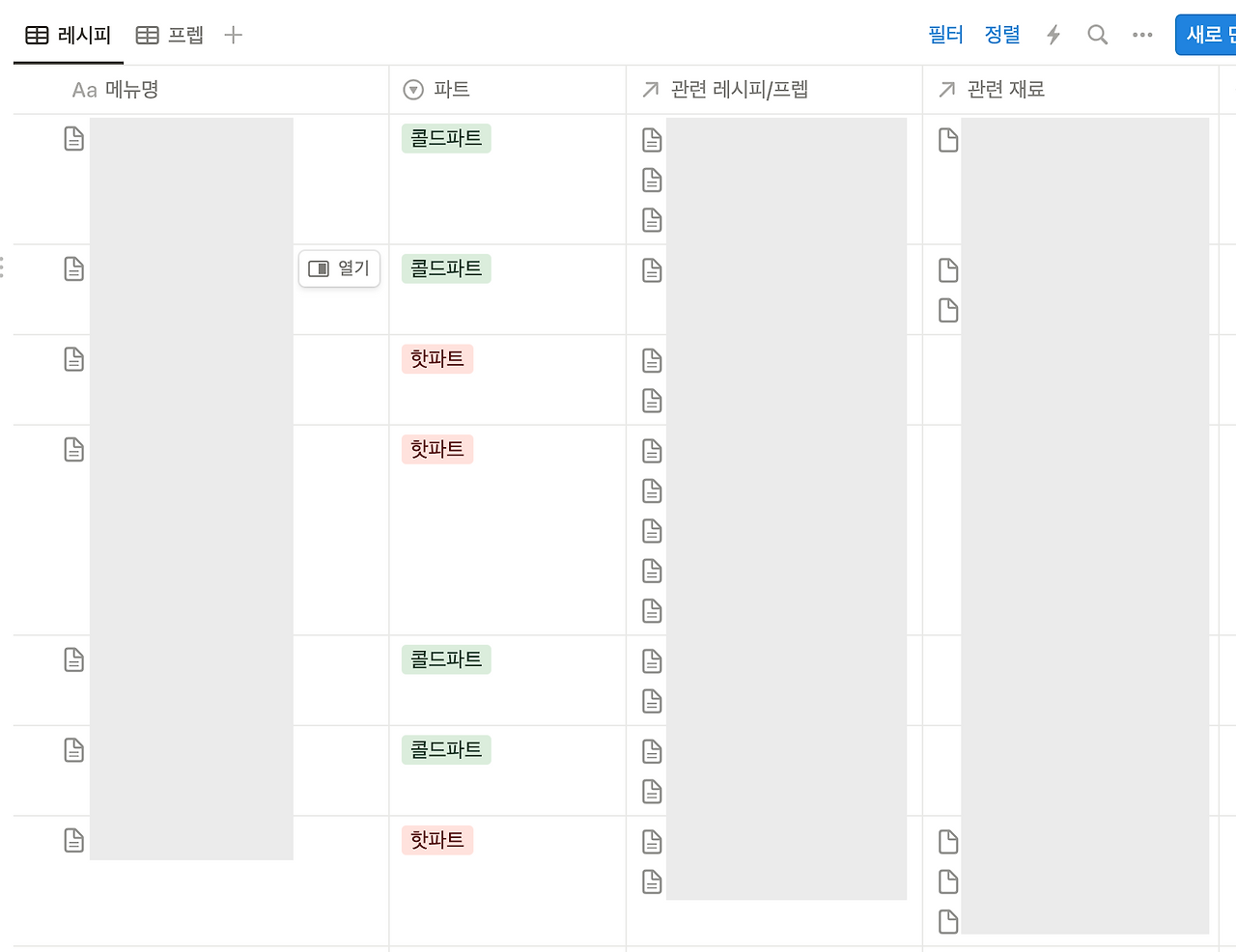 테이블에 각 메뉴의 레시피와 프렙을 함께 리스트업 했다. 여기서 프렙은 요리 시간을 단축시키기 위해 식재료 전처리 작업하거나 소스류 등을 미리 만들어 두는 것을 말한다. 카테고리는 메뉴명, 파트, 관련 프렙리스트, 그리고 관련 재료로 구성했으며, 프렙의 경우에도 마찬가지다. 프렙명, 관련 레시피, 관련 재료로 구성했다. 레시피와 프렙을 한 테이블에 모아뒀지만 서로 구분해서 볼 수 있도록 만들었다. 각 아이템을 클릭해 들어가면 상세 레시피를 확인할 수 있도록 했다.