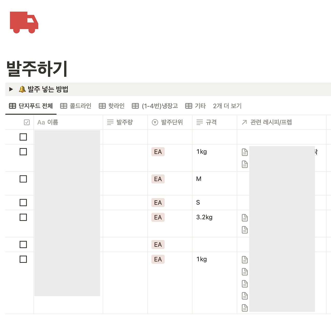 기존에 구축해 둔 프렙과 식자재 리스트를 활용하면 누가 발주를 보더라도 발주 시간을 단축시키면서도 발주 누락을 없앨 수 있지 않을까 하는 생각이 들었다. 발주 넣는 방법은 다음과 같이 진행된다. 먼저 다음 날 해야 할 프렙을 먼저 확인한 후 이에 필요한 식자재를 먼저 체크하고 이후 그 외 필요한 품목을 확인하는 식이다. 확인이 끝난 발주 리스트는 또 텍스트로 옮겨 적을 필요 없이 스크린샷을 찍어 그대로 공유하면 끝이다.