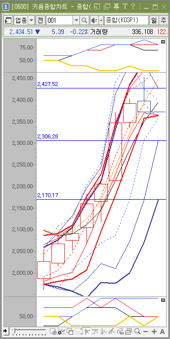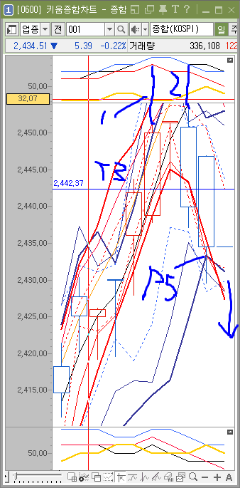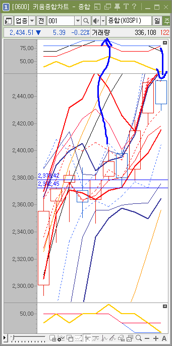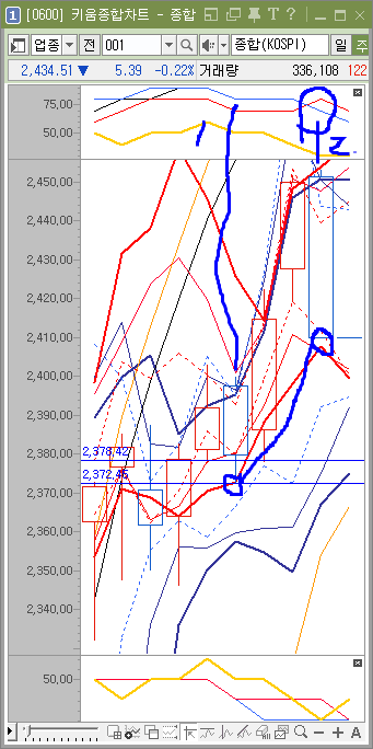 주봉이 다시 힘을 갖게 되면 주가는 2372 아래로 내려오게 되겠죠. 그러나 아직 주봉이 힘을 가졌다는 사실을 느낄 수 없습니다.