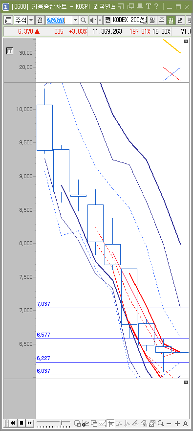 8월달의 모습입니다. 6037원 ~ 6227원 정도가 매수가입니다. 이제 상승하기 위해서 탄탄한 구조를 만들고 있습니다. 반면 저항선은 매우 둔화되어가는 모습입니다. 6577원 정도가 1차 청산목표가 되고 7037원이 2차 목표가가 되겠습니다.
