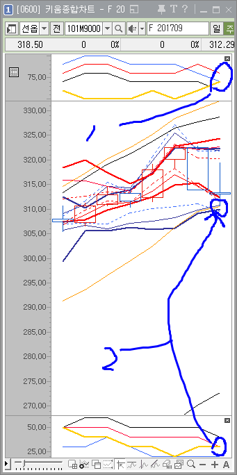 이미 7월달에 t5하단선을 사용한 흔적이 있습니다. 즉 현물이 아니지만 선물은 이미 모든 추세선을 사용한 상태 즉 이번달에 하락하면 추세는 끝이 납니다.그런데 매트릭스 구조가 아직 한번더 기회가 있으니 아마도 이번달 종가가 저가 형태가 되지 않는다면 아직 상승의 기회는 남았다고 보는 것이 더 옳은 판단이라고 봅니다.