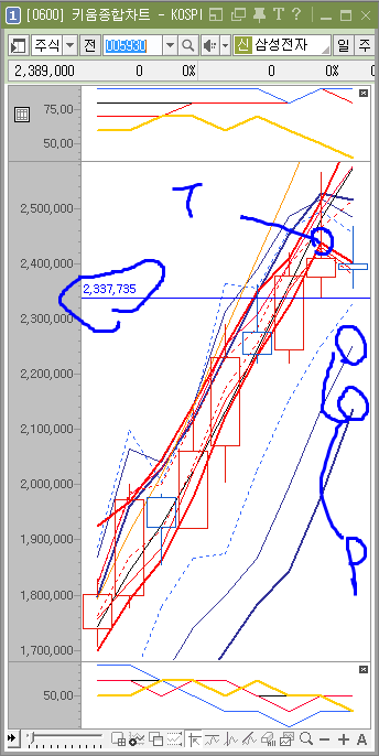 하이닉스보다 좀 더 심각한 상황이죠. 추세선이 죽어가기 때문에 저는 삼성전자의 전월 저점은 붕괴된다고 봅니다. 그래서 2339000원이 붕괴될 거라 예상하고 있습니다.