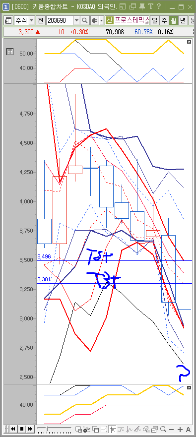 월봉을 보면 아직 전월이 음봉이기 때문에 그닥 좋지 않습니다. 따라서 일단 3300원 이하 매수가이면 청산을 하시고 난 뒤에 다음 전략을 고민하시고, 크게 물려 계시면 월봉상으로는 아직 물타기를 할 시점은 아닙니다.