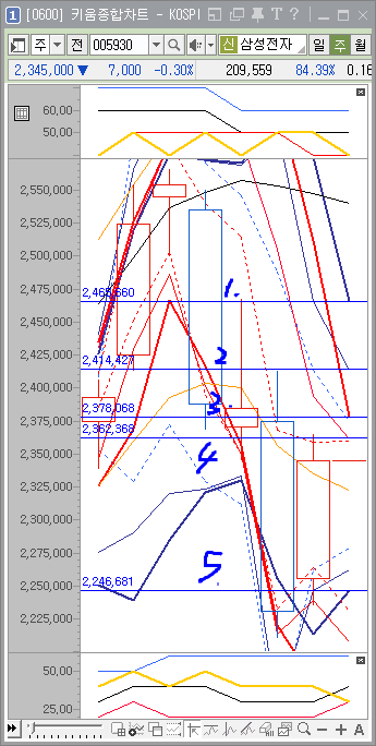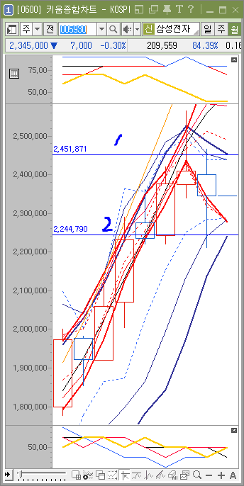 매수는 2246000원 수준입니다. 따라서 주봉상에서 매수전략은 거의 불가능해 보입니다.