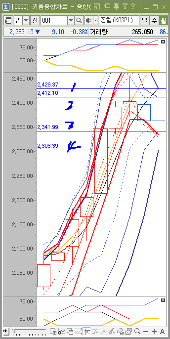 주봉을 보면 2332정도가 이번주 저가이고 시뮬레이션을 하면 대략 2341정도에 지지가 존재합니다.