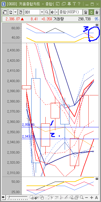 주봉을 보면 저항이 없습니다. 그런데 애석하게도 지지는 2343정도에 있습니다.