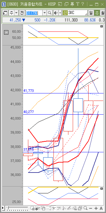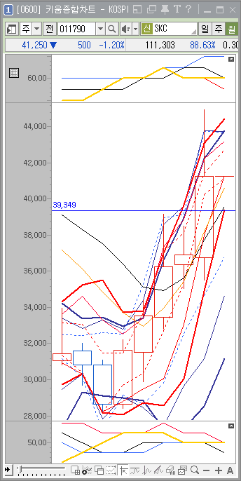 주봉은 37600원 ~ 40250원 정도에서 매수 전략을 가져갈 수 있고, 41700원 정도 위로 청산 전략을 가져갈 수 있습니다. 월봉의 매수 위치가 39300원이라는 점을 고려해 보면 2가지 전략이 가능하다고 보여집니다.