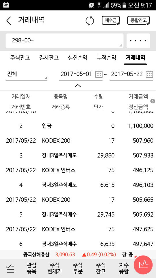 55만원씩 돈을 나눠서 55만원은 코덱스200을 매수하고 55만원은 인버스를 매수합니다.