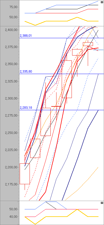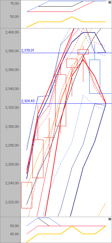 2324정도에서 반등여부를 가늠해 볼 것입니다. 그리고 이 지점 아래로 주가가 내려가게 되면 주봉도 더이상 힘을 내지 못하고 추세하락의 길로 접어들게 될 것입니다.
