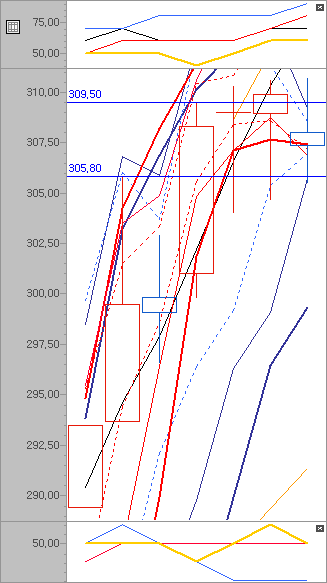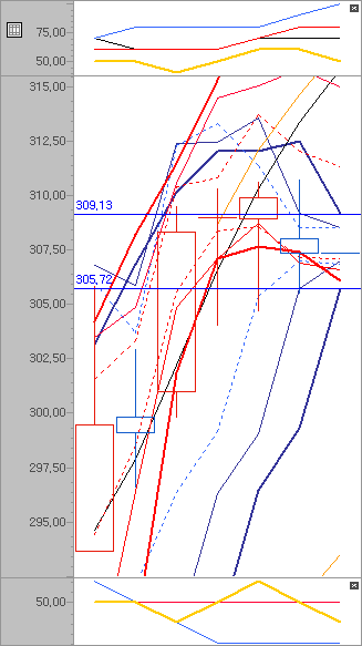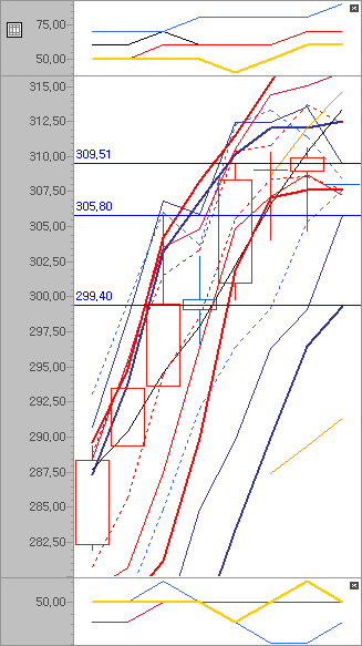 위에 볼린저밴드 상단선이 하향이 된 것을 볼 수 있습니다. 즉 이구조가 나타나야 하락할 수 있다고 가정을 하게 됩니다. 별다른 내용이 없습니다. 수렴하는 구조는 주가의 상승을 막는다라는 전제하에 분석을 하는 것이니까요. 아래의 내용을 근거로 해 보면 주가는 305.8 ~ 309.5 사이를 움직일 확률이 크다라고 해석할 수 있습니다.