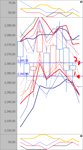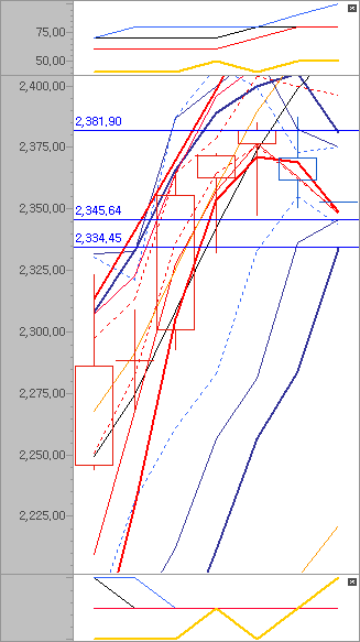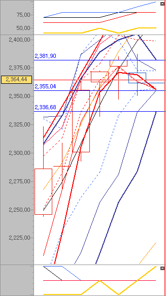 월요일의 흐름은 이정도라고 보여집니다. 만약 2358 이상으로 마감하게 되면 화요일은 좀 더 높은 단계의 상승을 기대할 수 있을 것입니다. 그 다음단계는 2381까지의 반등일 것입니다.