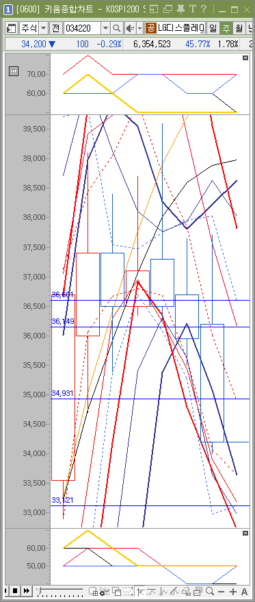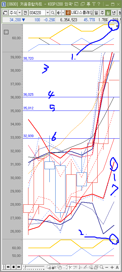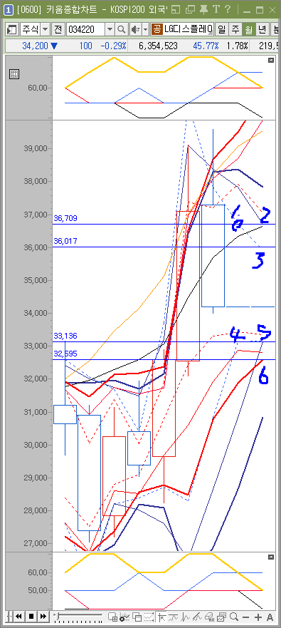 위로는 36150원 정도까지는 공간이 있어 보이지만, 문제는 아래쪽입니다. 아래쪽에 33100원 수준에 지지선이 보이긴 하는데 각이 참 둔합니다. 이 경우 34900원 정도까지 반등한 후에 33100원까지 내려갈 확률이 커보입니다. 오르고 싶지만 전체적으로 지지의 위치가 낮거나 그거에 각도또한 매우 둔하여 사용하기에 부담을 가지실 수 있습니다.