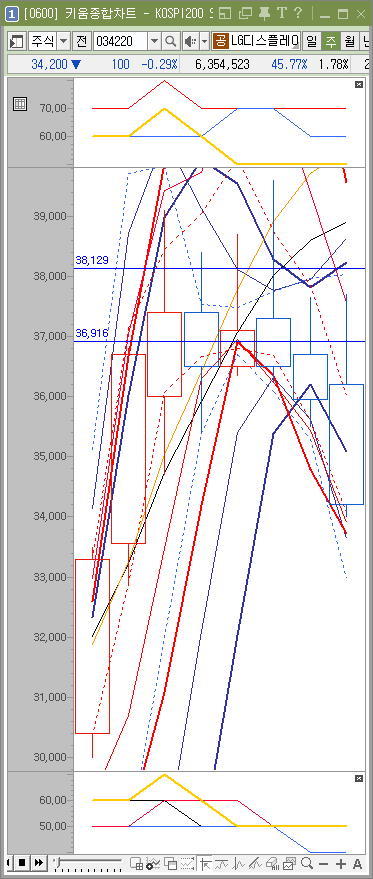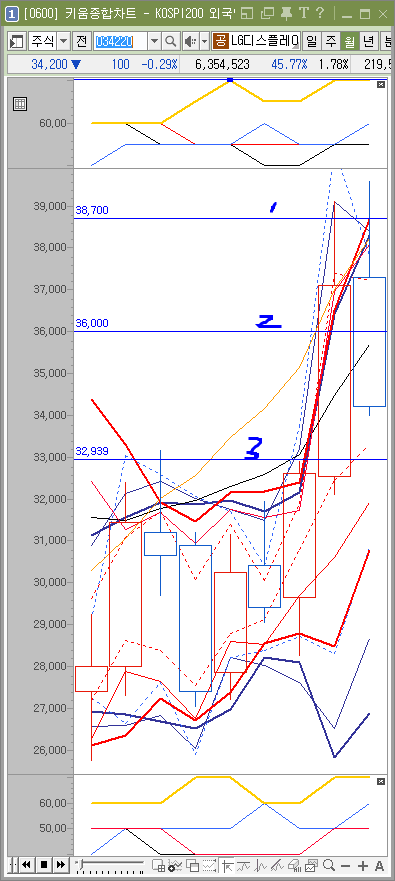 주봉과 월봉을 종합해 보면 일단 33000원대까지는 내려갈 의지가 보인다고 생각합니다.