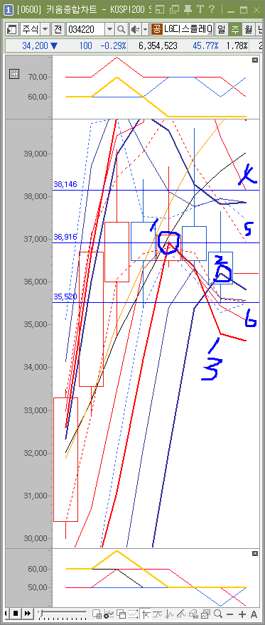 36025원 ~ 38720원까지가 전부 매도 영역입니다. 이 가격에 들어가면 매수는 포기해야 하는 구간입니다.