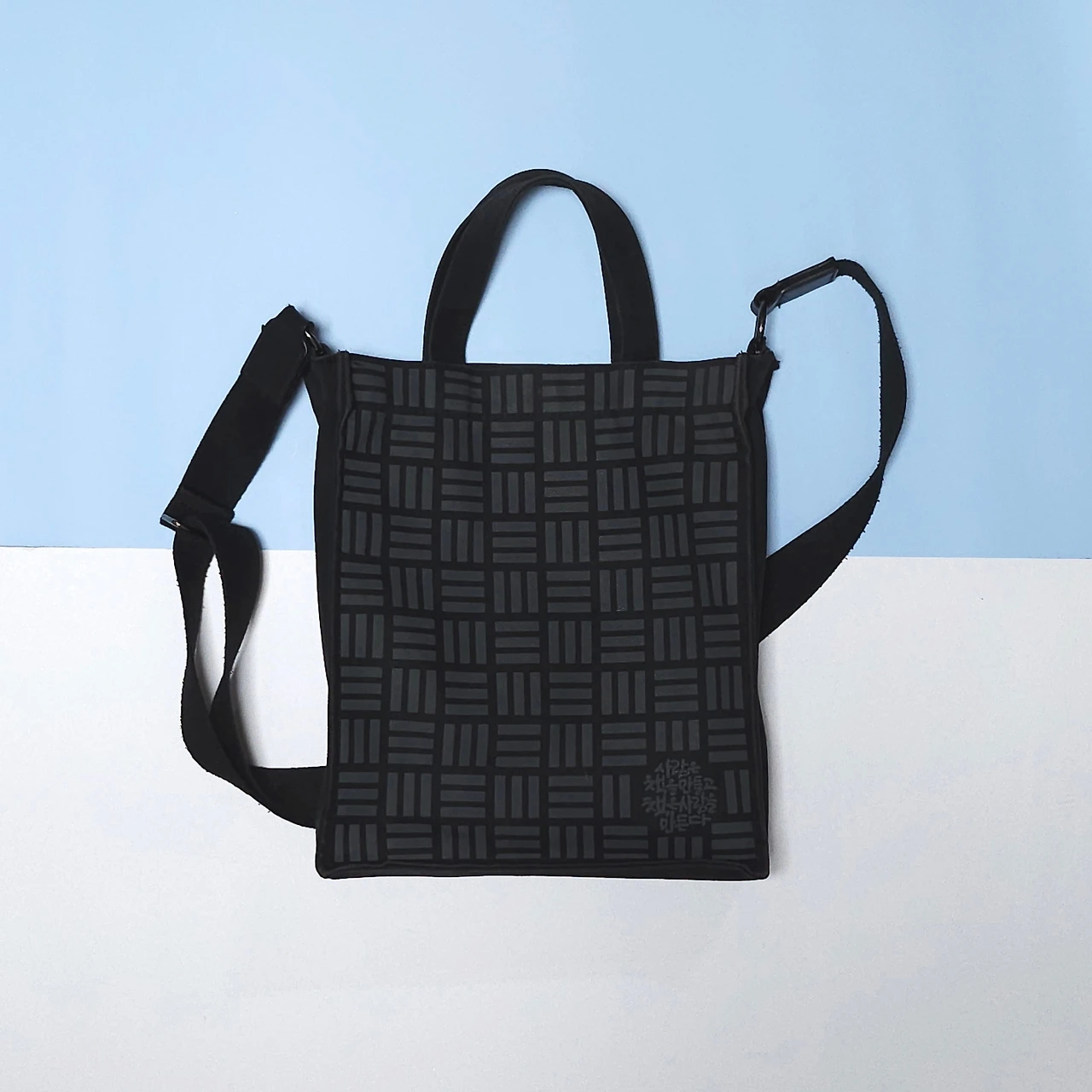 2년 가까이 가지고 다니는 가방이다. 교보문고에서 판매하는 물건으로 이름하야 '사람과 책 패턴 크로스북백'이다. 검은색과 아이보리색이 있는데 때가 잘 타지 않는 검정으로 골랐다. 에코백처럼 생겼지만 손잡이 말고 길이 조절이 가능한 크로스 스트랩이 있어서 어깨에 메고 다니는 경우가 더 많다.
