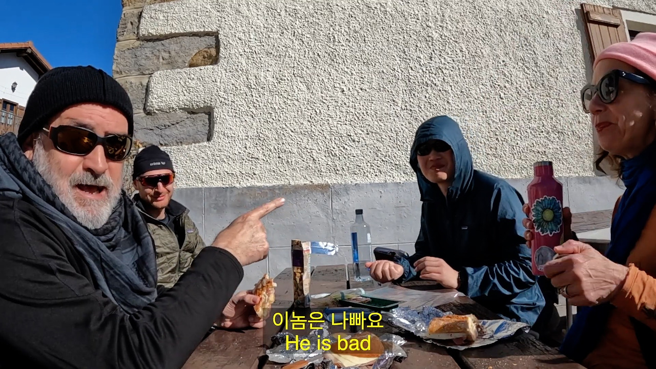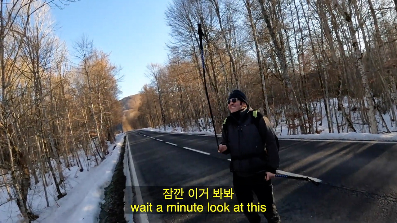 눈길로 걷다가 등산 스틱이 휘어버린 모습, 특유의 걸걸한 목소리로 말하는 스페인어,