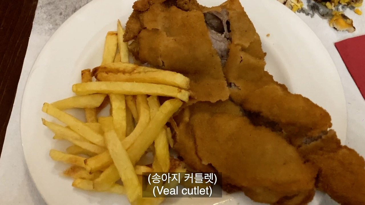 두 번째 접시는 송아지 커틀렛, 돼지고기보다 부드럽긴 했지만 역시 두께가 너무 얇았다.