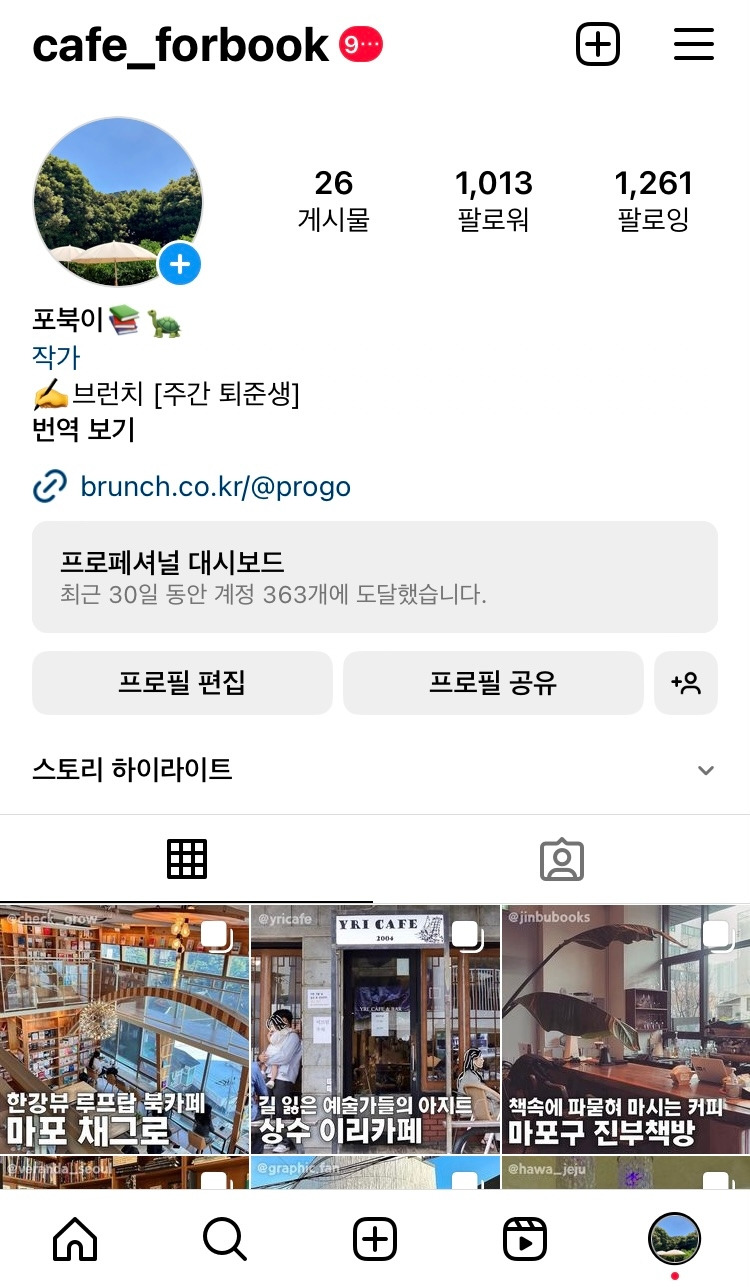 - '카페' 계정 한달만에 1,000 팔로워 달성 (cafe_forbook)