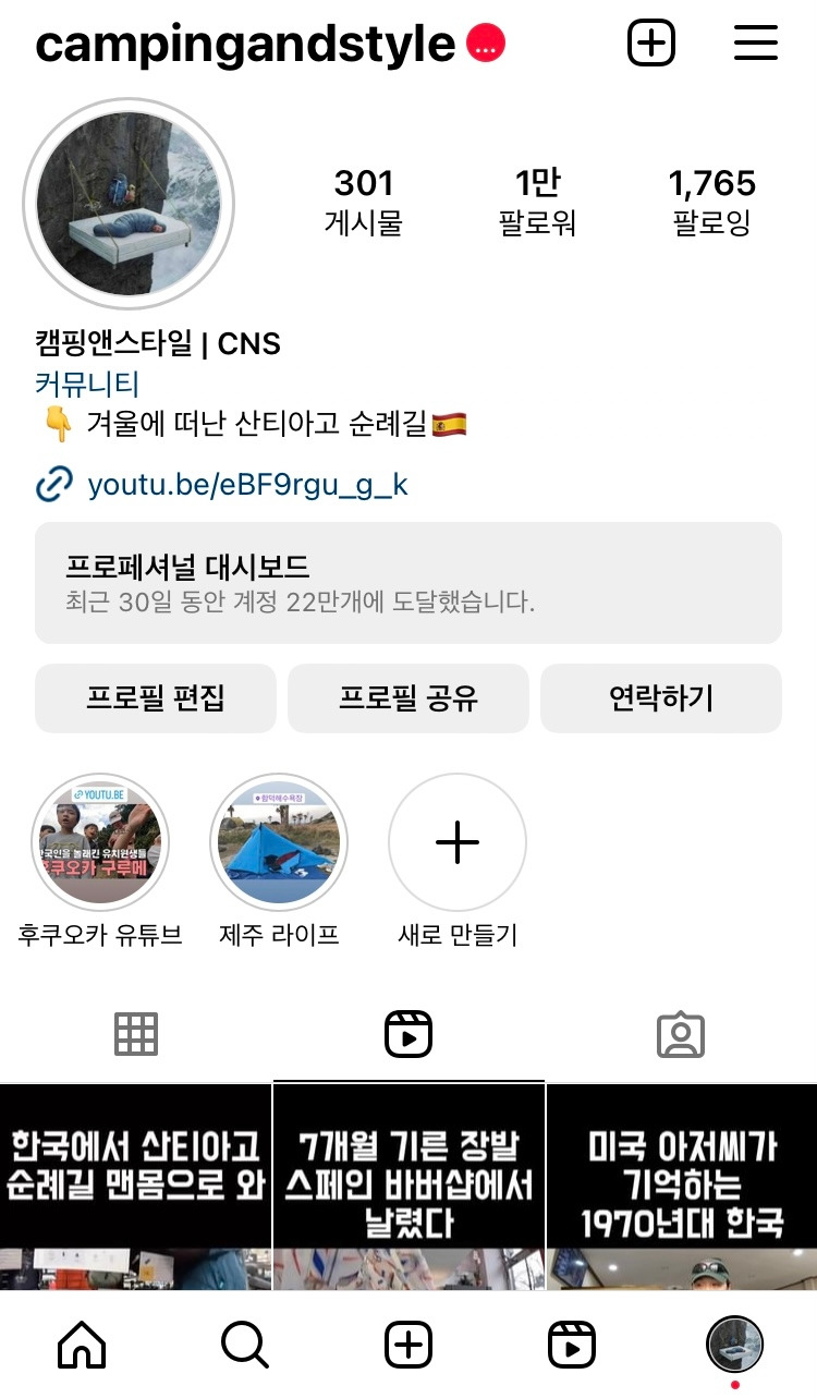- 직장을 다니면서 '캠핑' 계정 1년만에 1만 팔로워 달성 (campingandstyle)