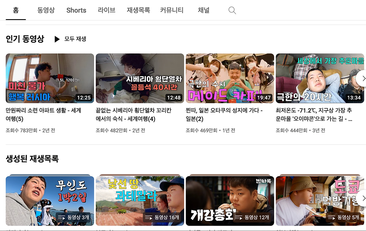 > 가장 인기 동영상은 '미친 물가 행복 러시아'라는 썸네일로 783만 조회수를 기록했습니다.