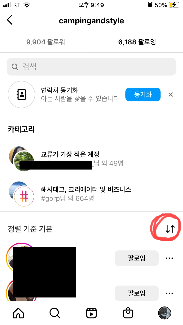 [내 계정 - 팔로잉 - 교류가 가장적은 계정]을 클릭하고 표시된 50명 모두 언팔 후 다시 계정을 클릭하여 '맞팔하기'가 있으면 클릭한다.