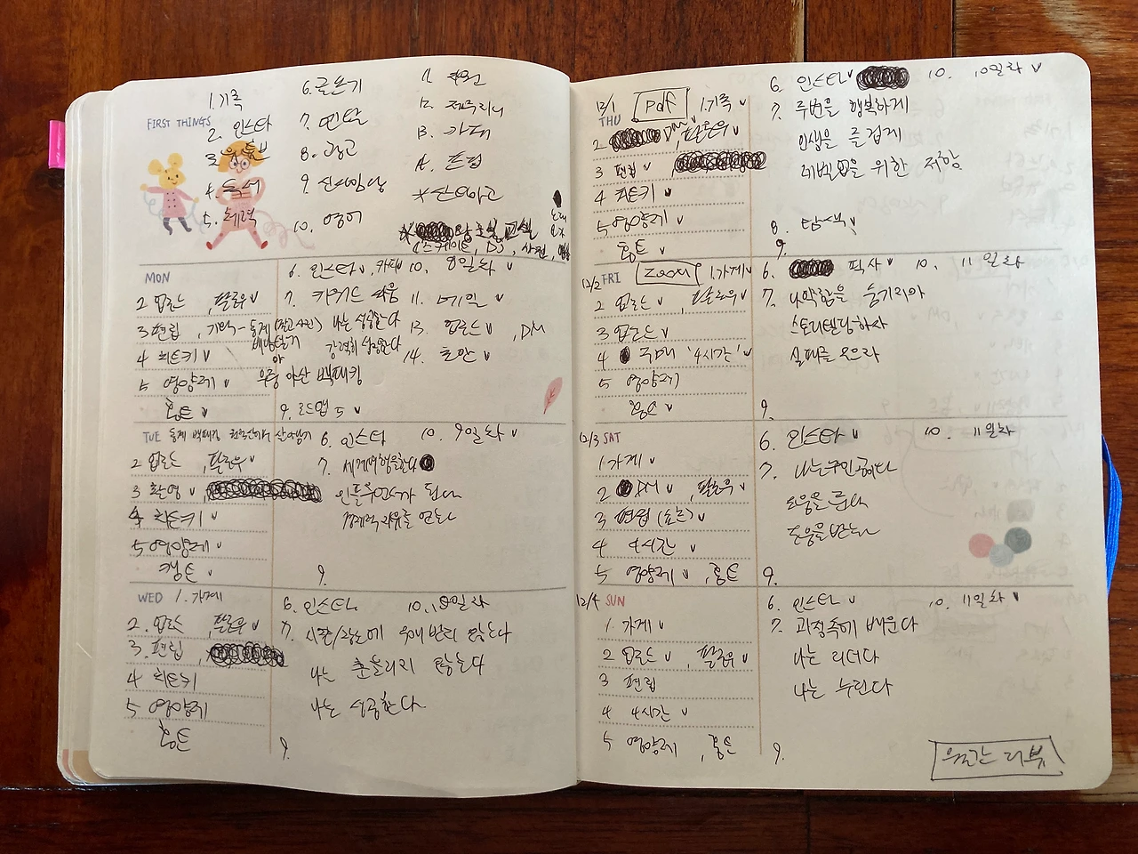 당연한 이야기지만 맨 앞장에는 1년의 큰 목표를 적고, 일주일 단위로 작은 목표들을 적는다. 월별로는 지난 과정을 분석하는 시간도 가진다. 분야별로 숫자를 적어 나누고 매일의 루틴과 요일별 할 일이 정해져 있다.