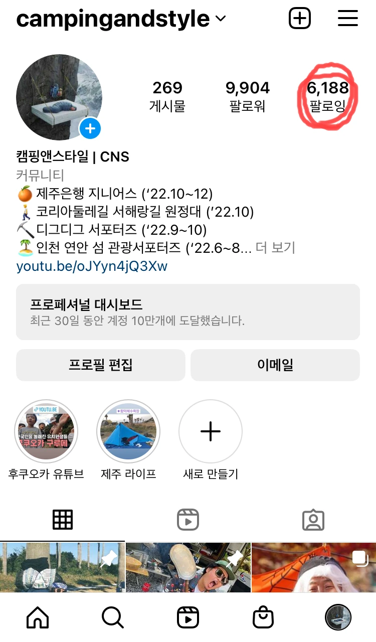 계정을 보시면 캠핑을 주로 다루는 채널이어서 노출되는 분들이 캠핑, 등산, 러닝 그리고 여행을 좋아하시는 분들입니다.