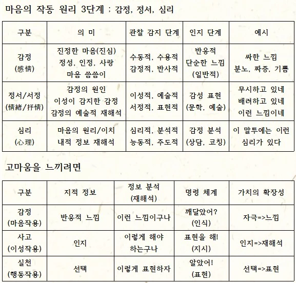 마음의 작동 상태를 나타내는 언어 중에는 감정과 정서(또는 서정)와 심리라는 비슷하지만 차원이 다른 단어들이 있다.