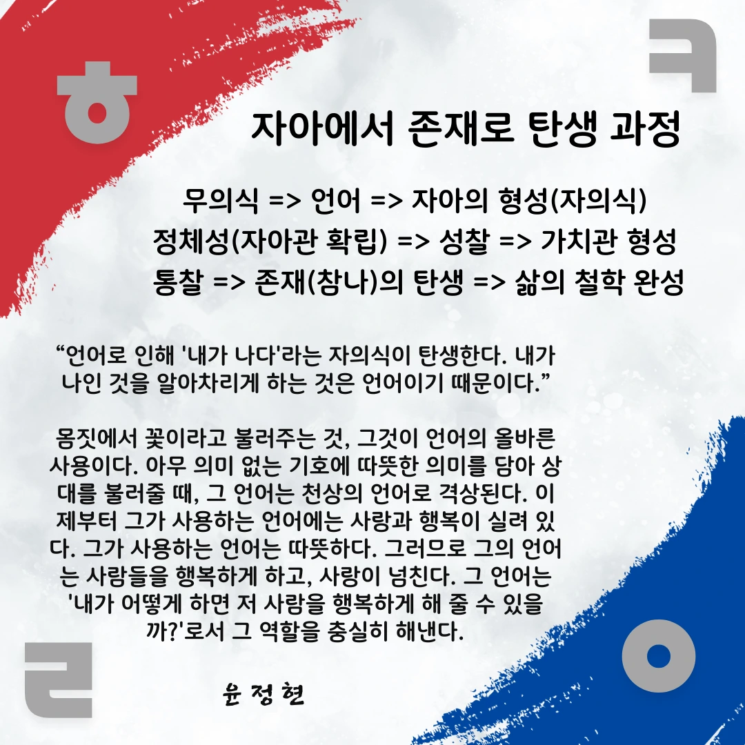 무의식 => 언어 => 자아의 형성(자의식) => 정체성(자아관 확립) => 성찰=> 가치관 형성 => 통찰 => 존재(참나)의 탄생 => 삶의 철학 완성