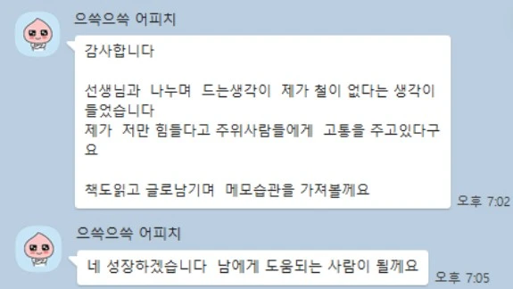 이렇게 스스로 돕는 자는 하늘도 길을 열어주고, 인연을 만들어줍니다. 6개월, 1년만 지나도 완전히 달라진 자신을 만나 볼 것입니다. 자신감을 가지고, 자신의 신분이 누구인지 인지하시고, 더 아름다운 세상을 살아내기 위해 온몸으로 부딪히세요. 잘 되실 겁니다. 화이팅!!!