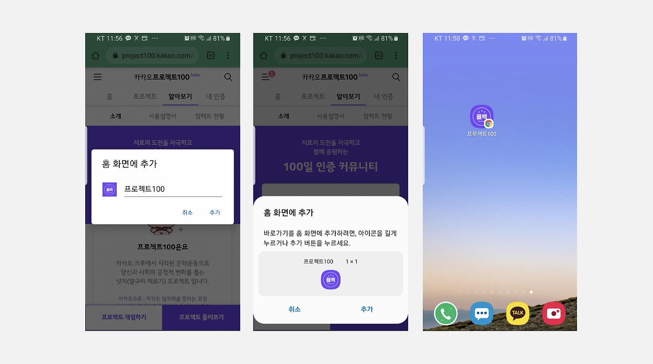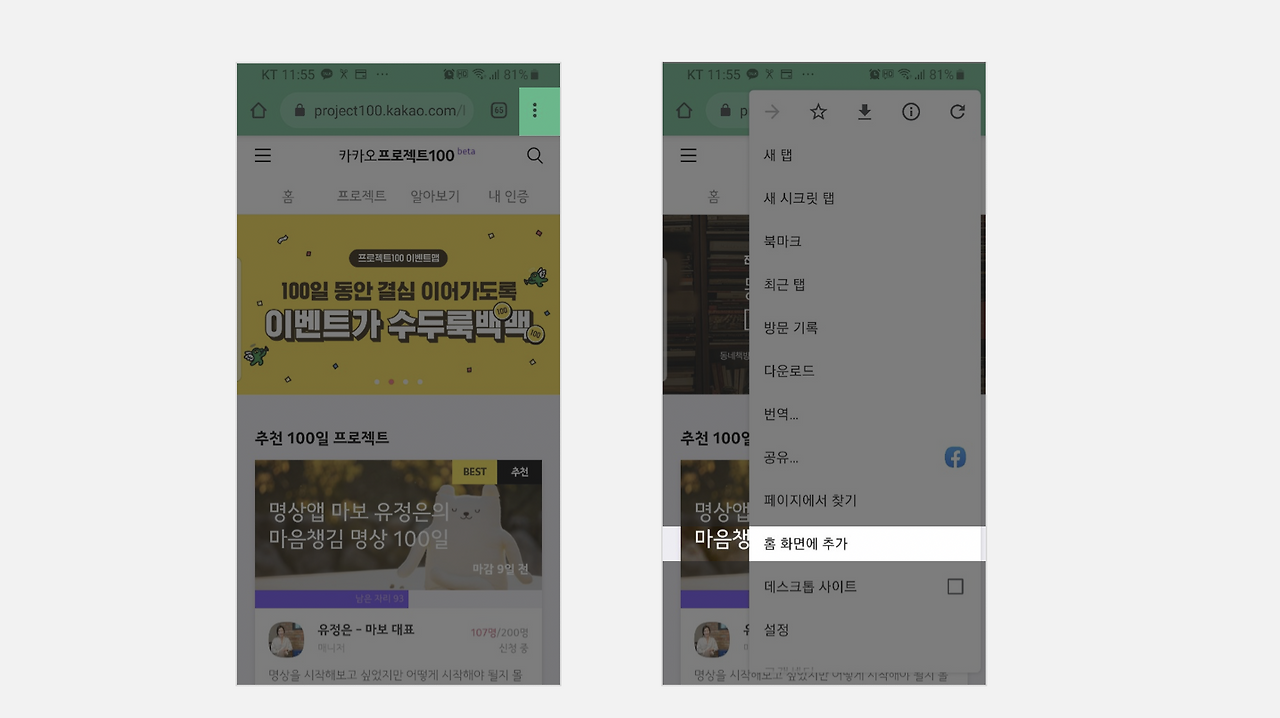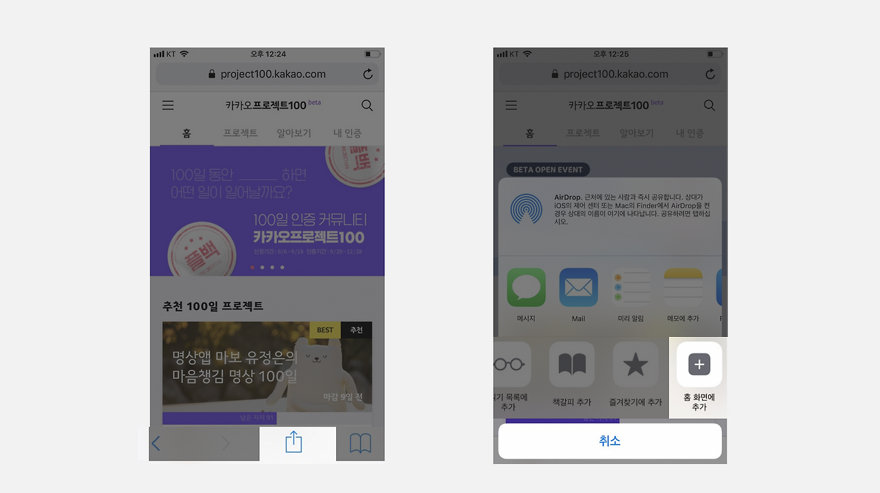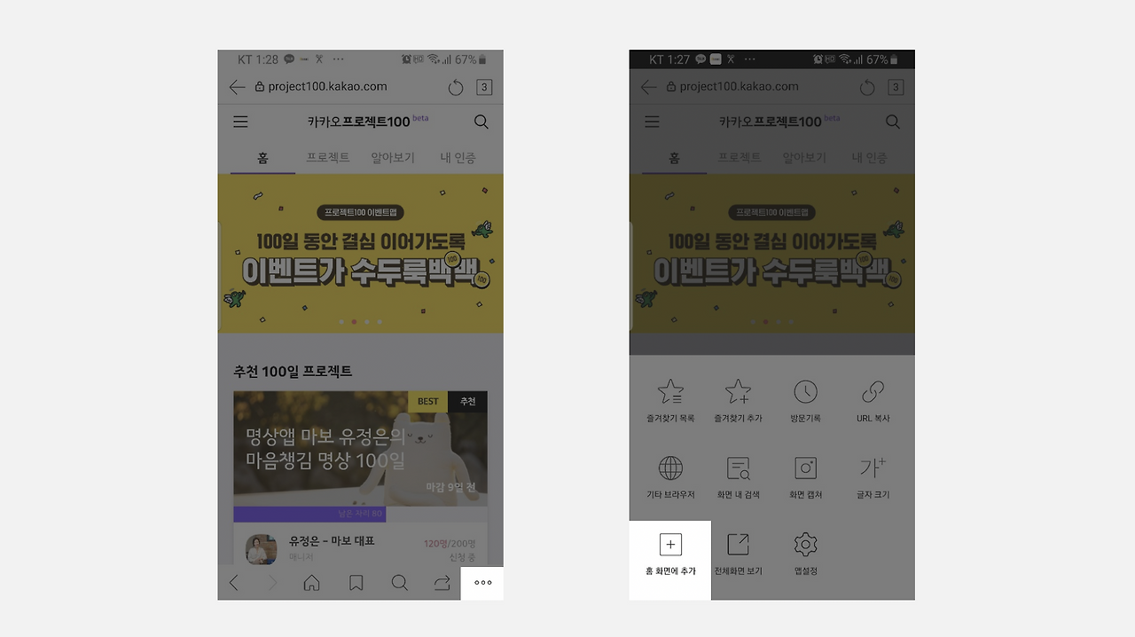 ! 카카오톡 채팅방에서 띄우는 브라우저에서는 홈 화면 추가가 어려워요. 내 휴대폰의 기본 브라우저에서 프로젝트100 서비스에 접속해서 진행해주세요.