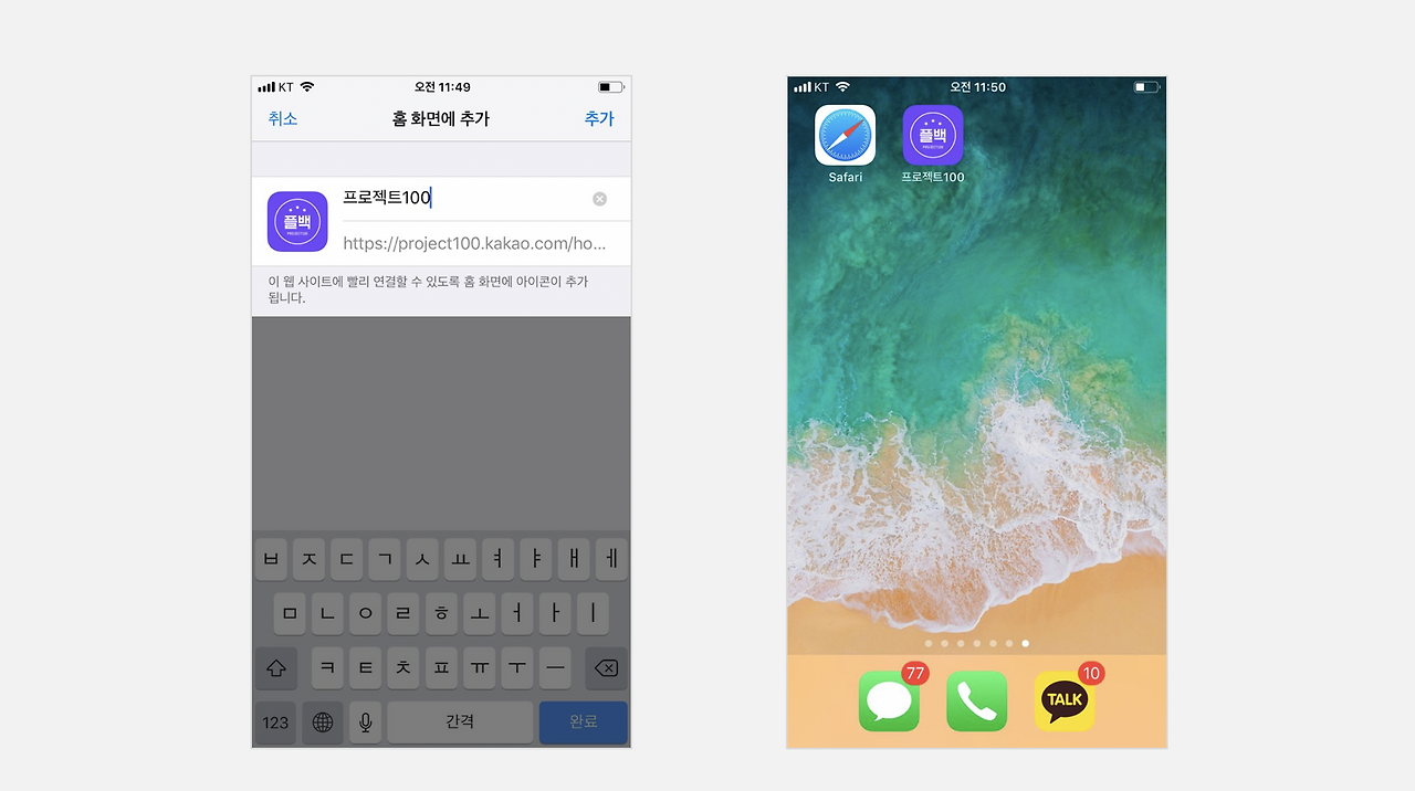 2. '홈 화면에 추가'라는 페이지가 나오고, 자동으로 아이콘과 주소, 프로젝트100이라는 사이트 이름이 나옵니다. 페이지 우측 상단의 [추가]버튼을 누르면, 내 아이폰에 바로가기 아이콘이 짜잔! 추가 완료!