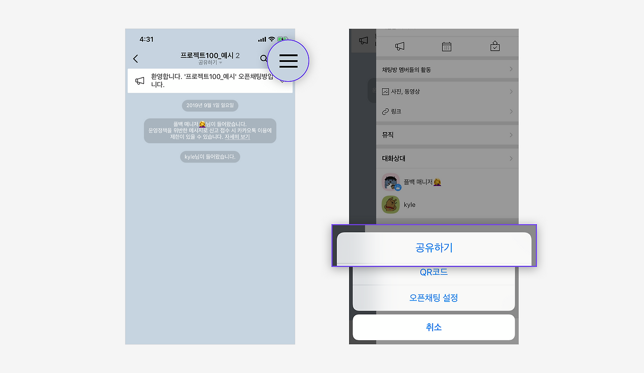 • 오픈채팅방 우측 상단 메뉴를 통해 공유하기를 누르면 링크가 복사됩니다.