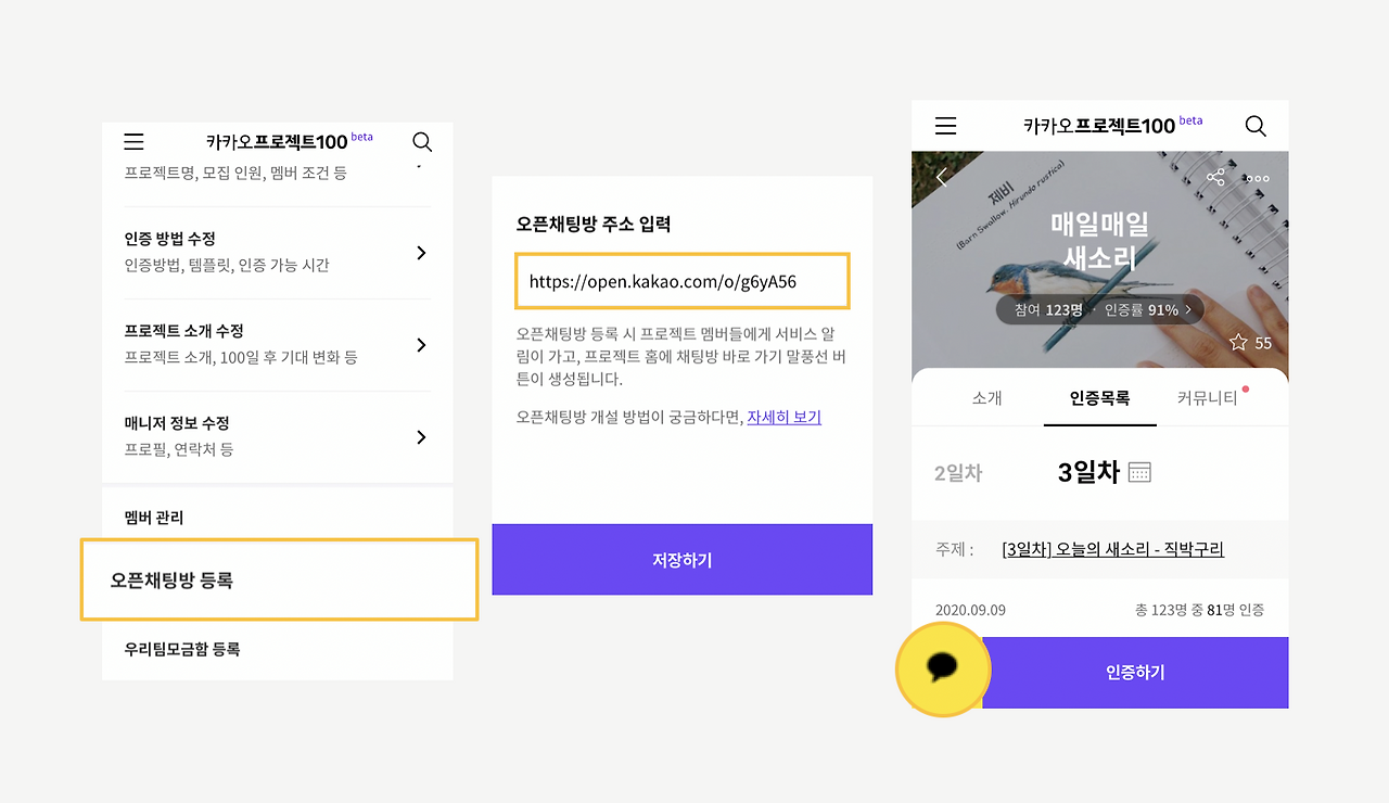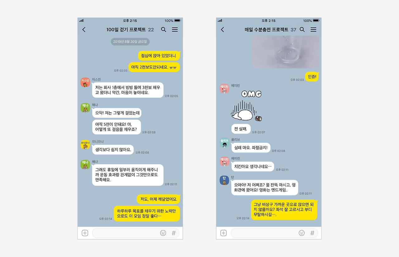 사소한 실천에도 다양한 의미를 부여해주며 지지하는 멤버들이 있어 ‘인증’만으로도 기분이 상쾌할 때가 있습니다. 가끔 실천하지 못한 날에도, 멤버들의 따뜻한 잔소리가 있어서 다시 도전 의지를 가다듬곤 하죠. 같은 목표를 공유하며 매일 인증하는 멤버들과 함께 카카오톡 오픈채팅방을 활용해 사소한 대화를 나누고, 랜선 동지애를 키워보세요.
