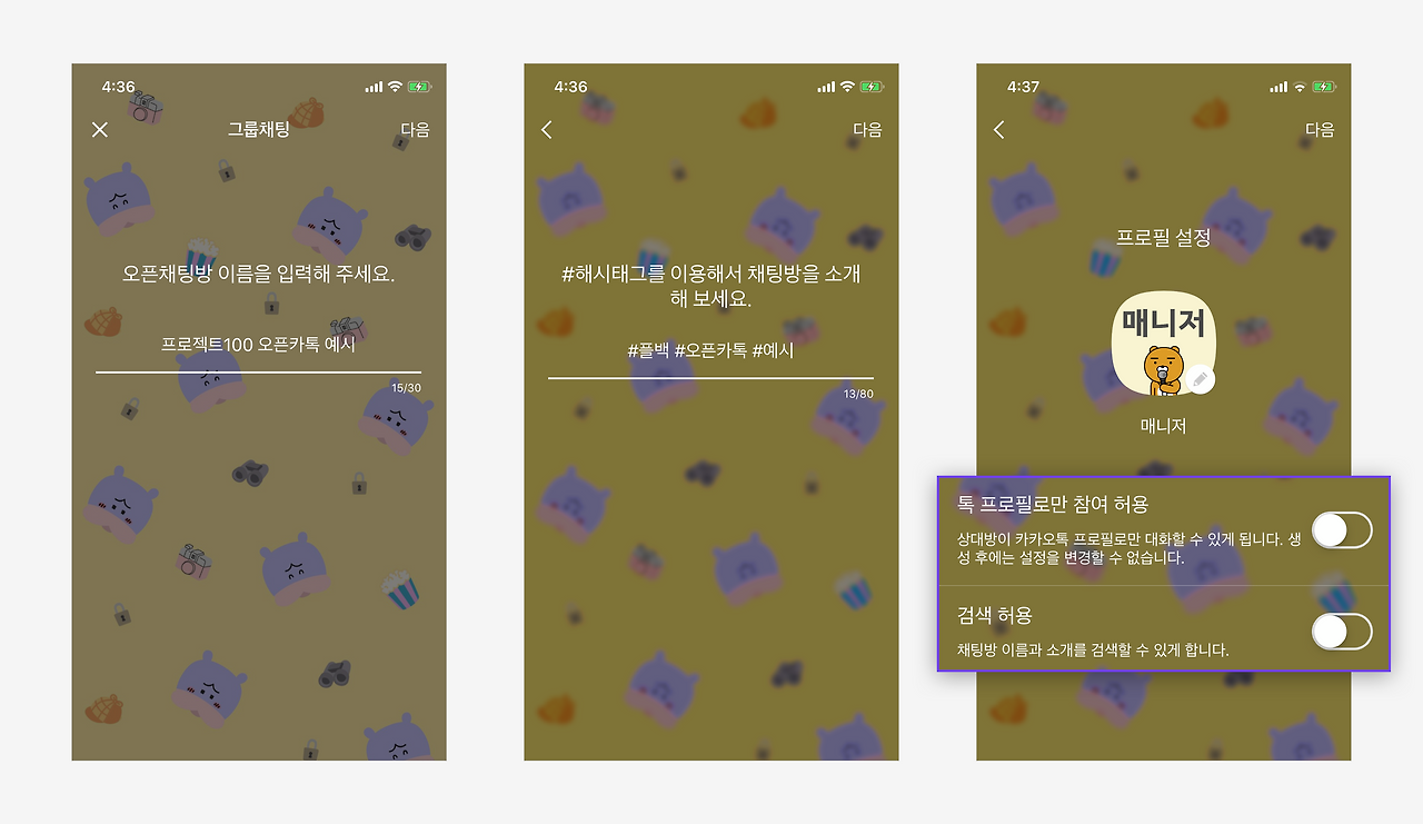• 멤버 간 익명성을 유지하고 싶다면 ‘톡 프로필로만 참여 허용’ OFF로 설정할 수 있습니다.