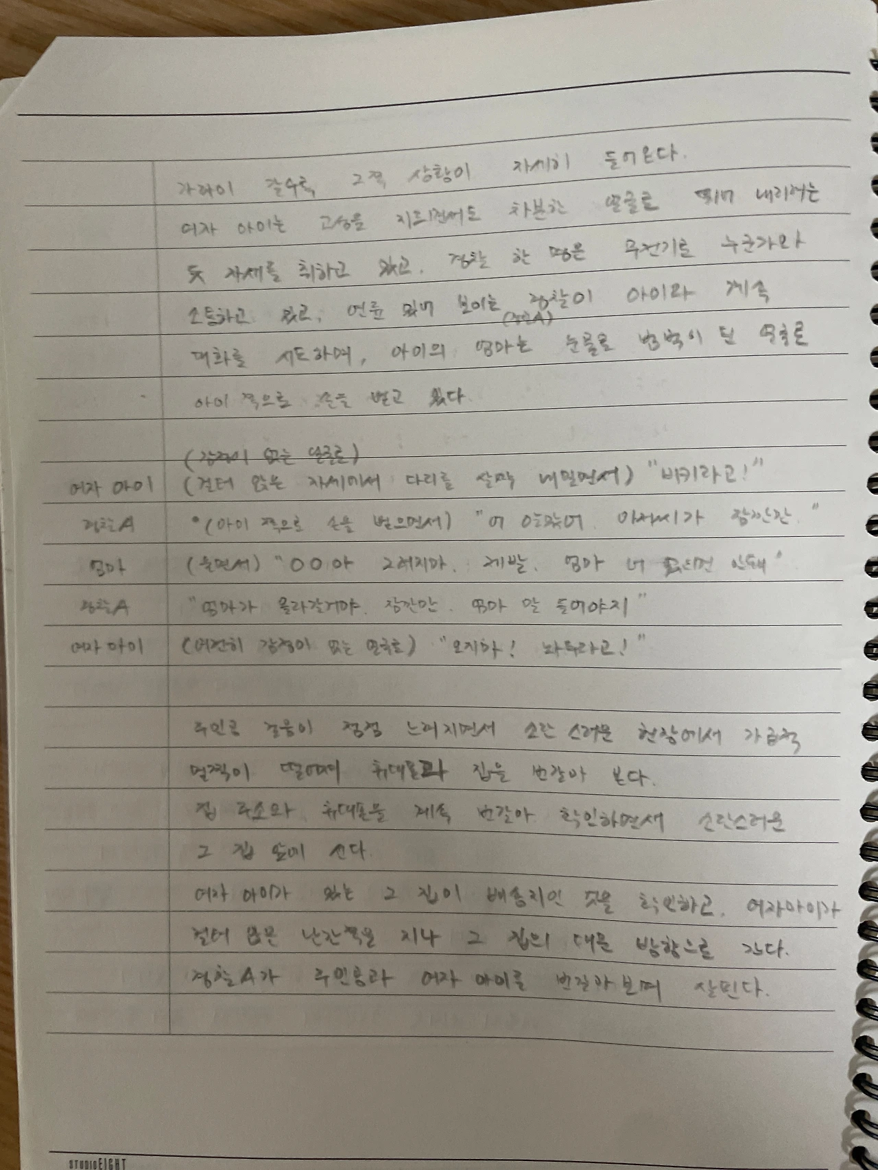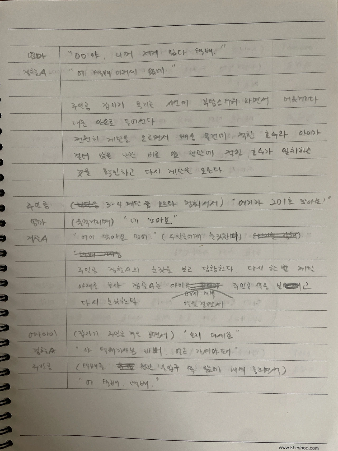 무엇보다 이것이 시나리오를 1도 모르는 사람이 쓴 것이 맞다는 걸 한눈에 알아볼 수 있는 이유는 도무지 소설인지 시나리오인지 수필인지 알 수 없다는 것이겠네요. 이걸 적어놓고 다른 시나리오도 찾아보고 용어도 찾아보면서 정체 모를 글이었다는 걸 알았습니다.