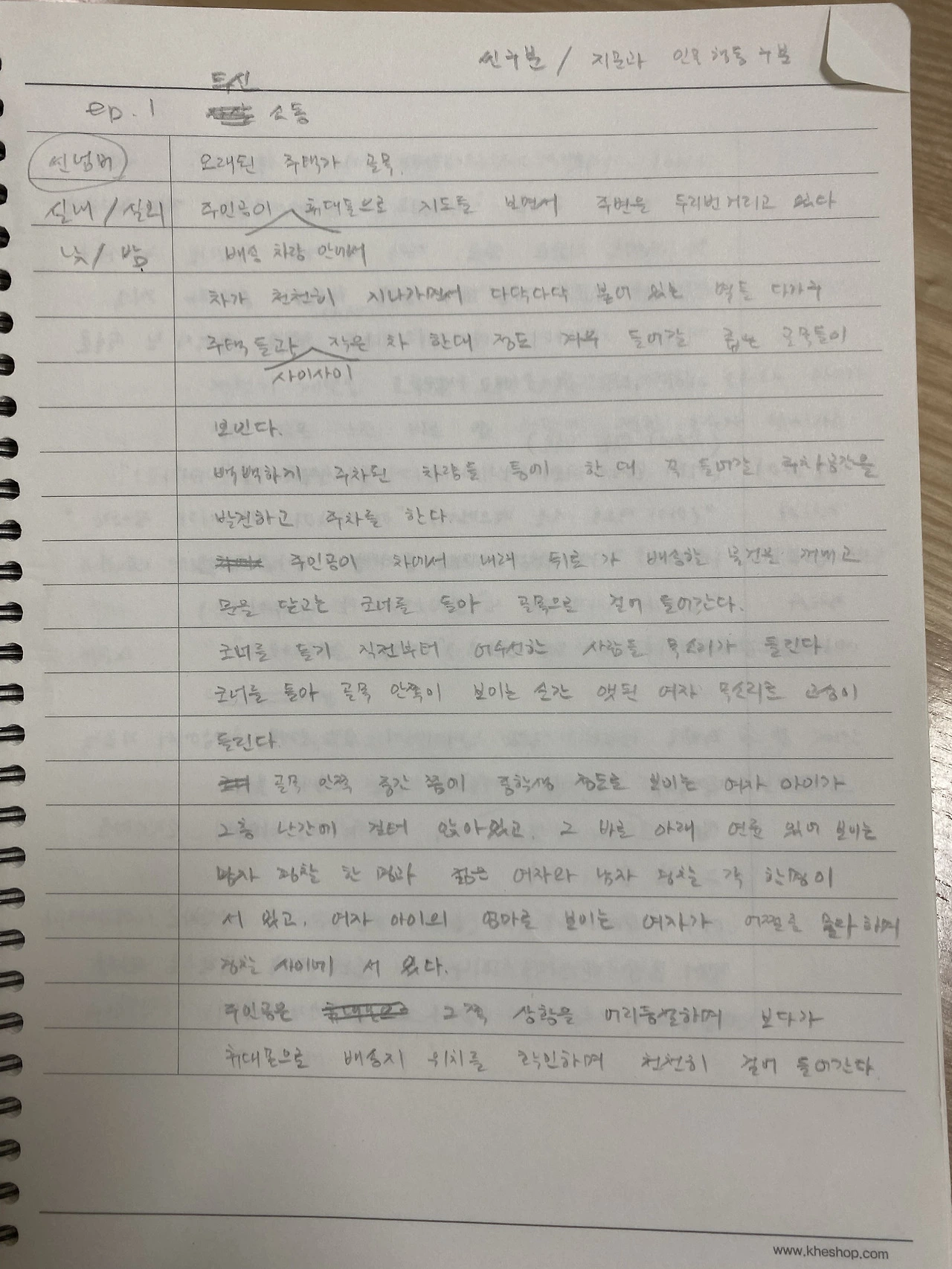 '일단 쓰기 시작하라'는 아내의 조언을 듣자마자 노트와 연필 하나를 들고 적기 시작한 글입니다. 제게 중요한 건 말 그대로 일단 써보는 것이었기 때문에 우선 적어두고 싶었던 사건 하나를 생각나는 대로 글로 옮겨두었습니다.